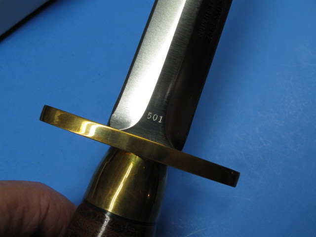 Brass” Buffalo Bill Presentation Knife. Engraved blade